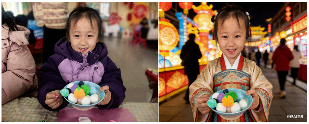 “AI闹元宵”环节:孩子们用稚嫩的语言表达元宵心愿与祝福,志愿者通过AI技术将美好期许转化为生动的动漫风格祝福图像,实现传统节日与现代科技的巧妙融合,让孩子们近距离感受AI科技的神奇魅力。