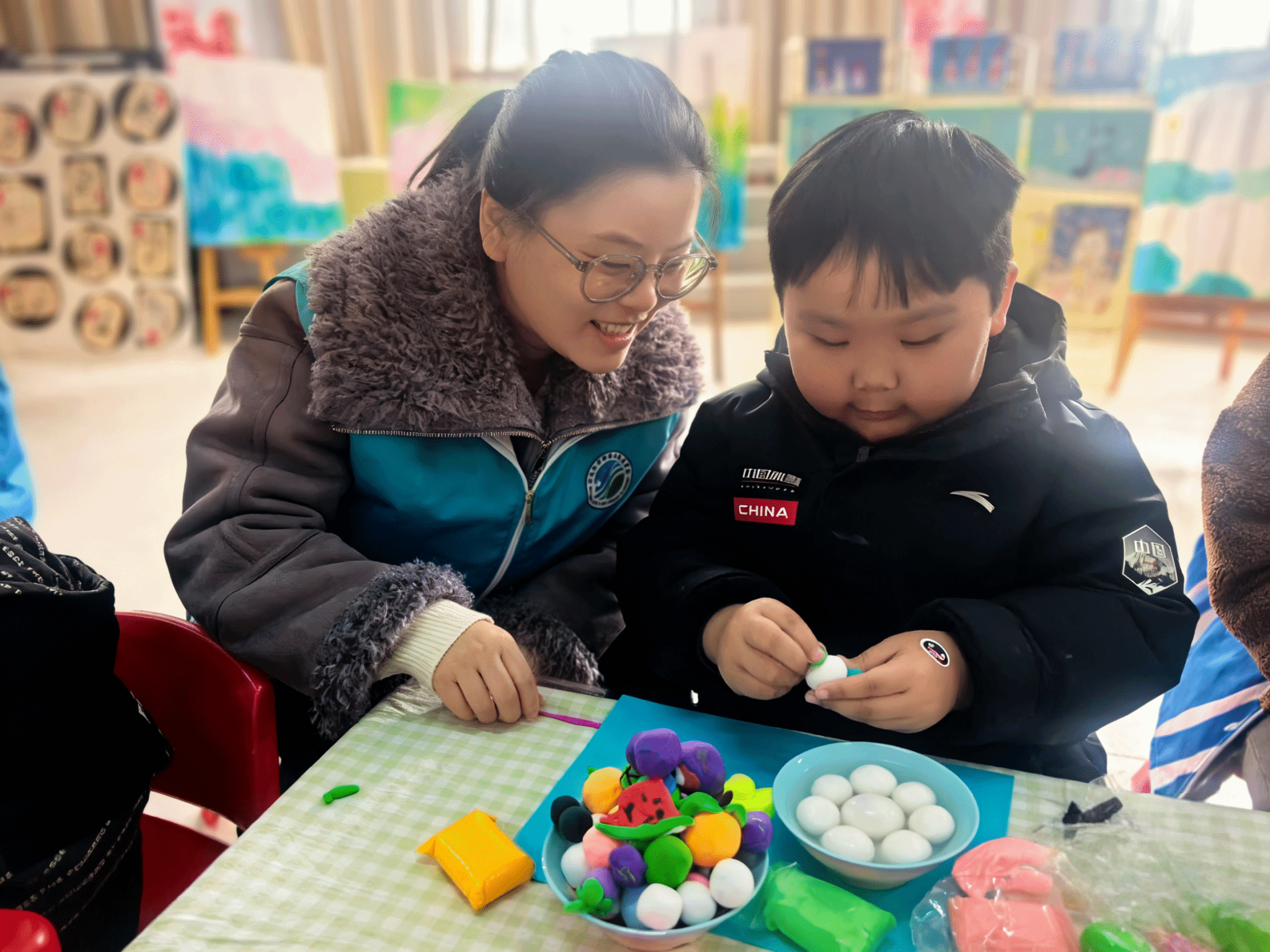 巧手传承环节:志愿者带领孩子们开展“巧手做元宵·彩泥庆团圆”手工活动。孩子们手持彩泥,在志愿者的指导下搓、捏、团,制作出形态各异的彩泥元宵与灯笼,在动手实践中体验劳动乐趣,感受团圆的美好寓意,同时增强动手能力与团队合作意识。